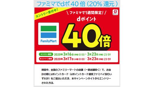 3月17日から23日まで、ファミマでdポイントカードを提示するだけで、dポイントが最大40倍(20%還元)もらえます。 同時に開催される街中のお店でd払いすると、dポイントが10%還元されるキャンペーンを併用すると、最大30%のdポイントが還元されます。 具体的…
