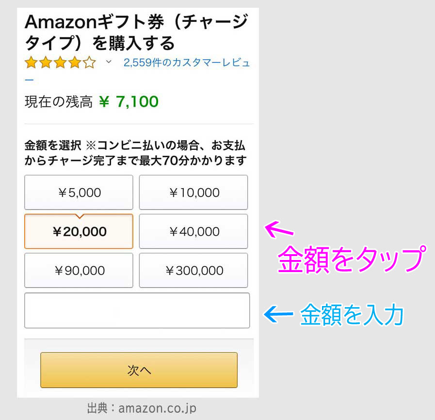 金額を選択もしくは、20000円をタップか入力後、「次へ」ボタンをタップします。