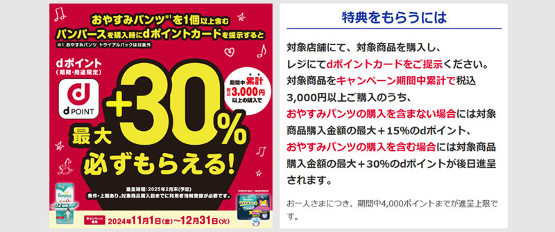 おやすみパンツを買うと30%還元になる条件は同じですが、こちらはdポイントカード提示で最大30%還元となります。