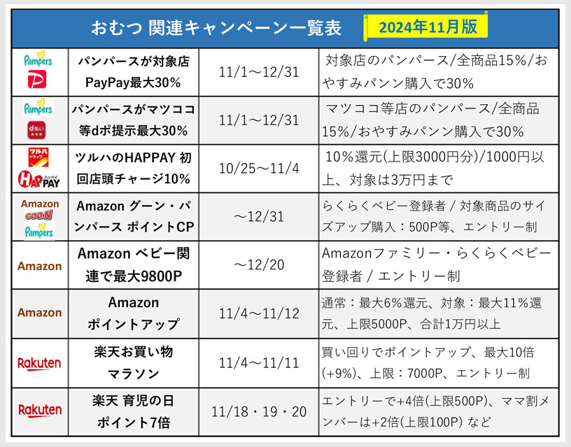 この記事では、ページの前半でおむつ関連キャンペーンを一覧表で紹介し、ページの後半で各キャンペーンの内容を紹介しています。